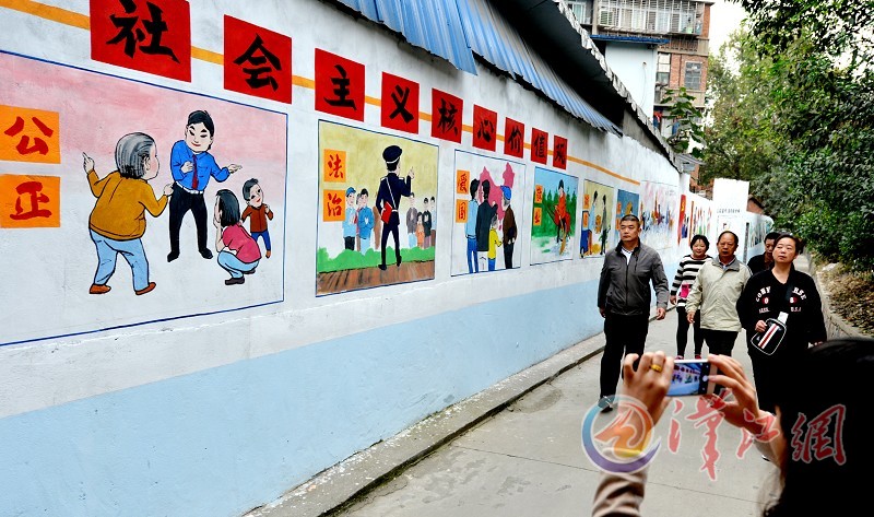 近日,樊城大庆西路社区将辖区一条通道的围墙改造成文化墙,图文并茂宣传社会主义核心价值观,受到居民赞扬。