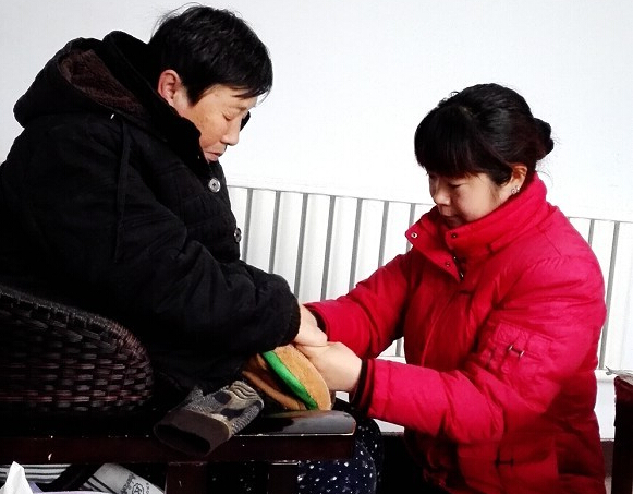 中风后,李文华右胳膊和右腿无法行动,她为此常常发脾气,但赵淑芳从不抱怨,总是好言相劝。一有空,赵淑芳就驮着婆婆重新学习走路。半年后,李文华的症状有所减轻,赵淑芳用一根绳子绑在李文华的右腿上。每次练习时,李文华的左腿挪一步,赵淑芳就用绳子拉着婆婆的右腿挪一步。