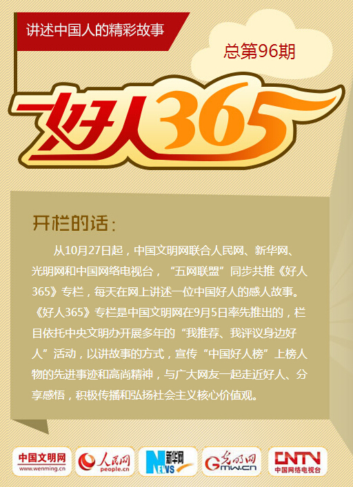俗话说,人生有三好:做好事,存好心,做好人。中国文明网开设《好人365》栏目让越来越多的好人被大众熟知,从这些好人身上,我们看到了中国民族源远流长的传统美德,看到了这个社会最质朴的真善美。